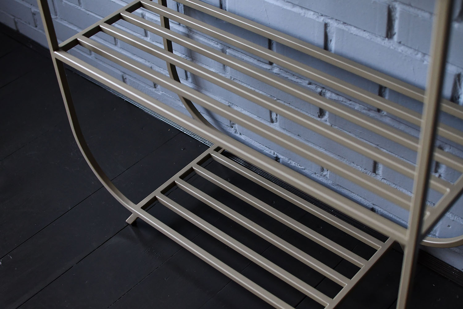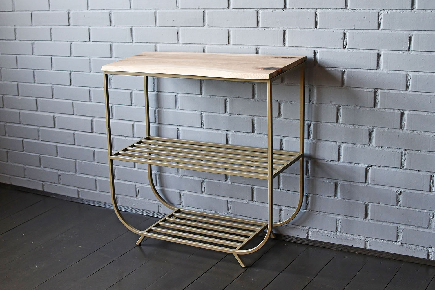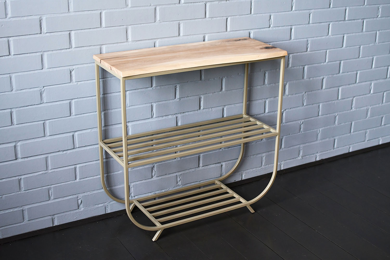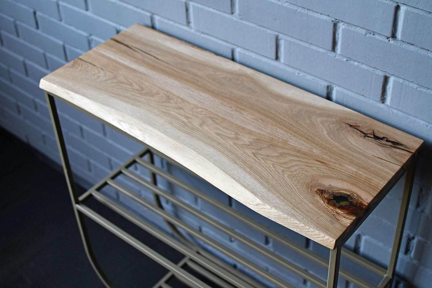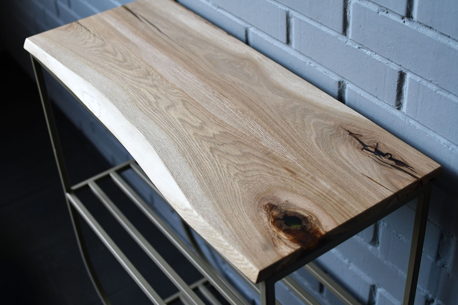 Верхняя полка из массива дуба с живым краем покрытаматовым бесцветным лаком, подстолье из металла покрыто порошковой эмалью.