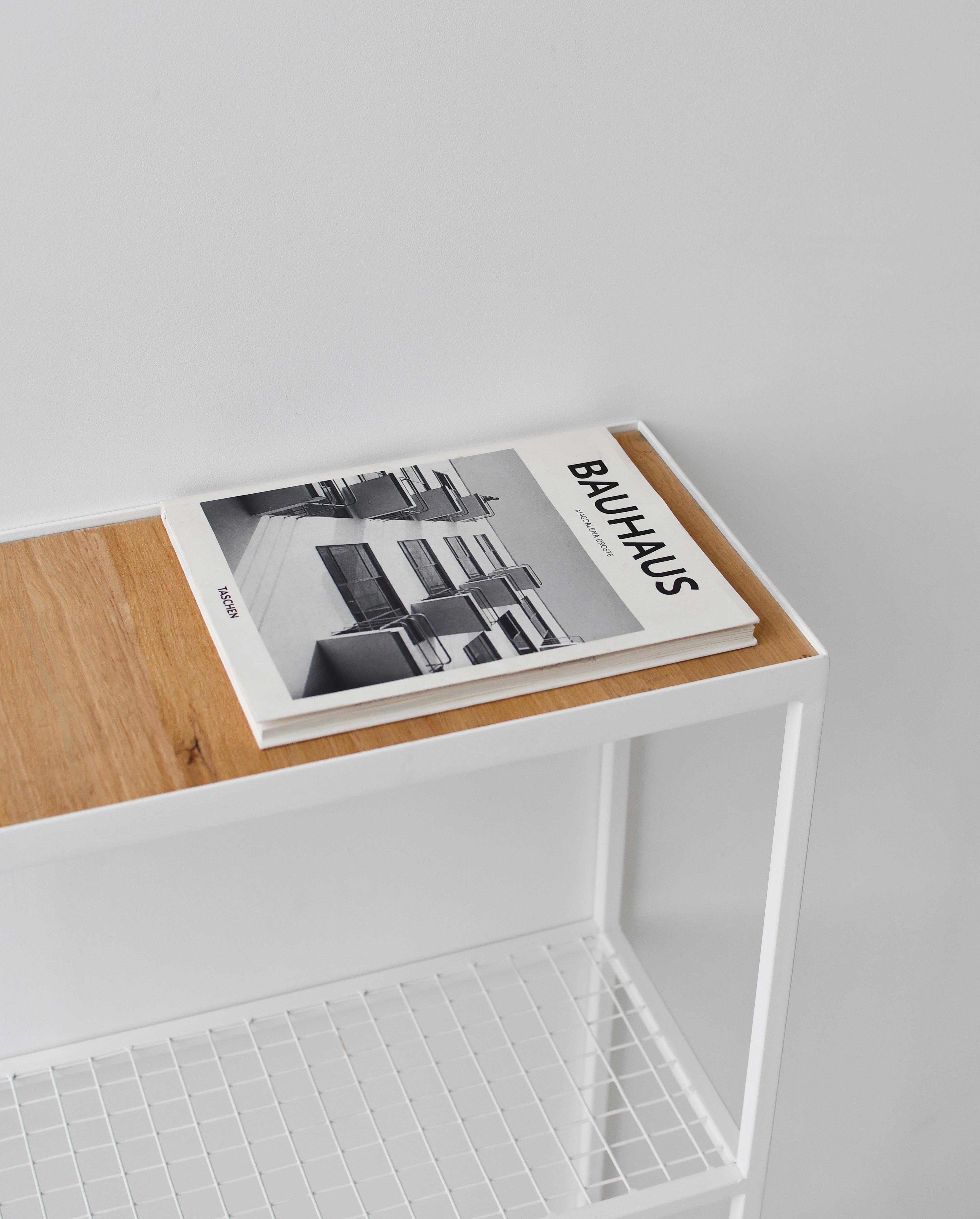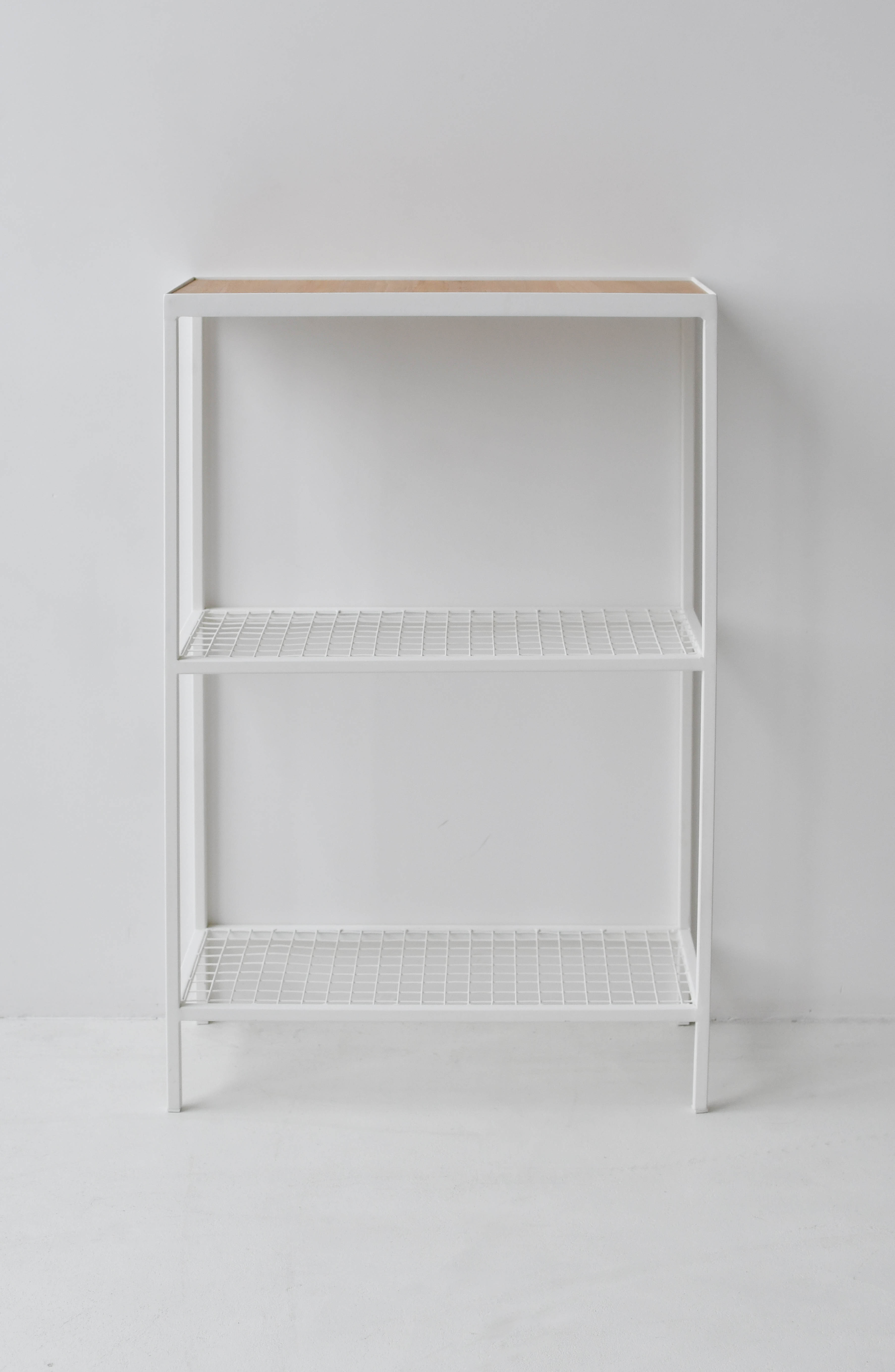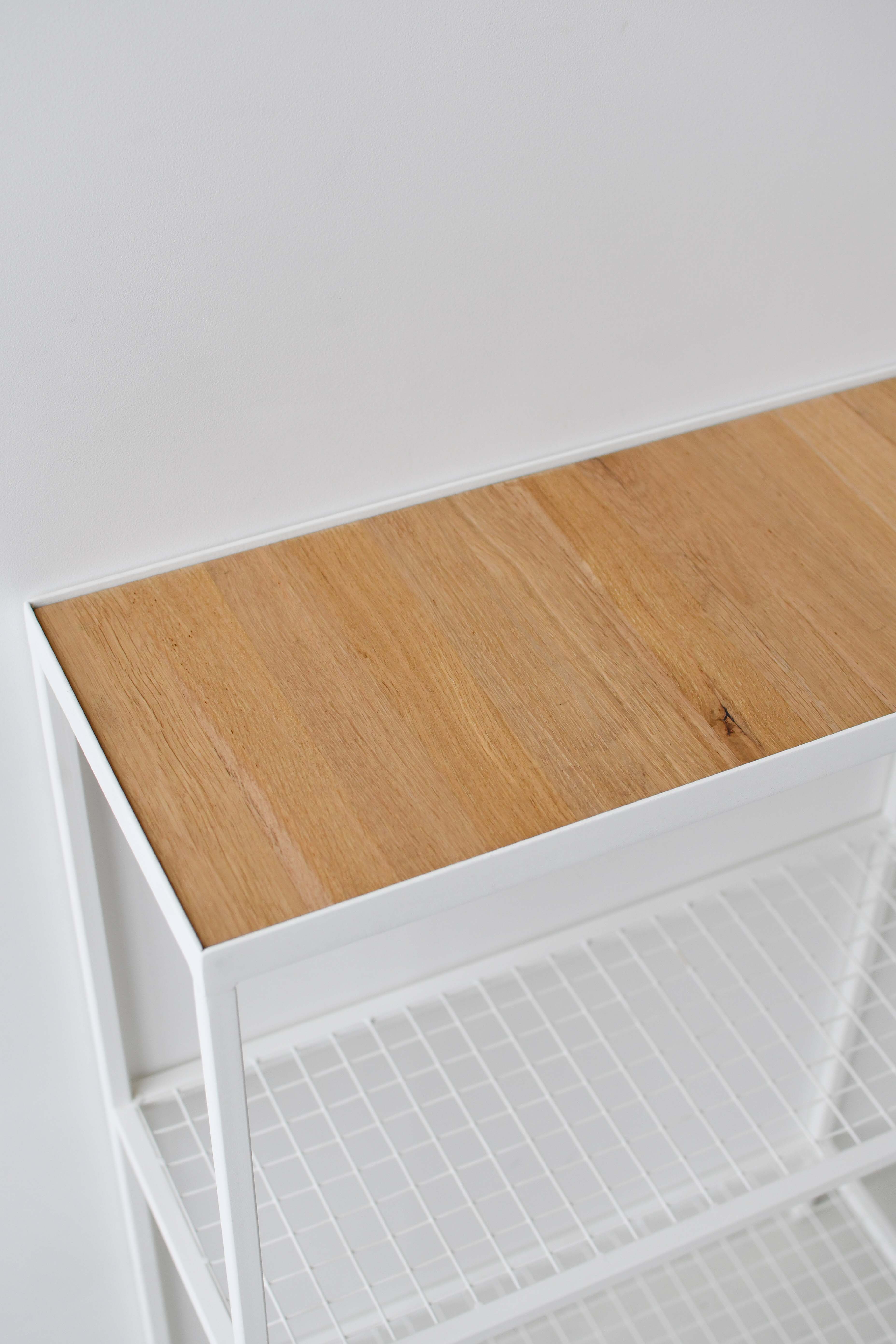 Верхнюю деревянную полку обрамляет металлический бортик высотой 5мм, не позволяющий скатываться предметам.